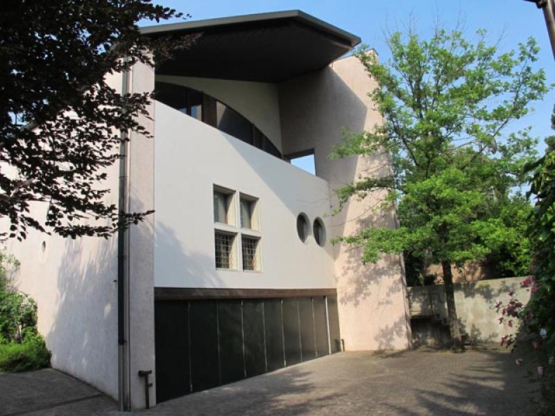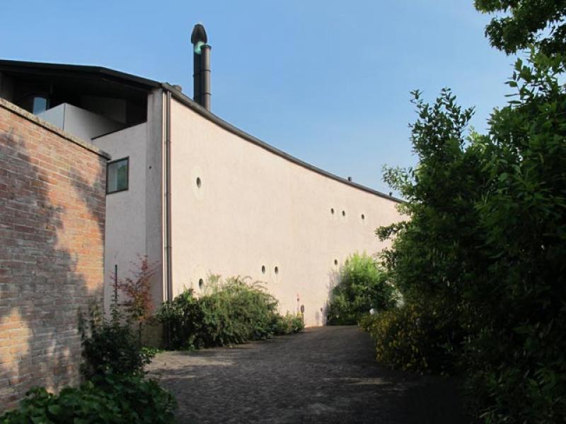 L'edificio sorge sul sedime di un’antica fornace e "si trova ubicato ai margini del centro storico di Guastalla, e si articola su tre volumi la cui reciproca disposizione è tale da determinare un grande patio centrale, comune all’intero sistema, e tre cortili perimetrali. La casa si chiude in se stessa privilegiando il rapporto tra gli spazi interni ed il sistema di corti, rifiutando, attraverso la presenza del lungo muro curvo, quello verso ovest a negazione di un paesaggio urbano di mediocre qualità.” (Zanichelli 1991).