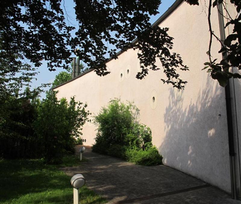 A volumi diversificati, per forma e destinazione, corrispondono spazi aperti differenti. Quello principale, in cui si trovano gli ambienti diurni e al ricevimento degli ospiti, è prodotto dall’accostamento di due spessi muri ed è costituito internamente da un grande spazio a doppia altezza enfatizzato da una porta di accesso di contenute dimensioni. Ai piani superiori si trova una stana per la musica, uno studio, i locali di servizio e i vani scala. Un percorso sospeso attraversa il soggiorno e connette questi ambienti posti ai lati del volume. Le murature del corpo principale, trattate a intonaco di cocciopesto, marmorino e cemento a vista, sono forate da aperture circolari di diversi diametri e strombature, allineate sui due fronti sia longitudinalmente sia trasversalmente in modo da poter attraversare con lo sguardo l’interno e stabilire interessanti punti di vista dall’interno verso l’esterno e viceversa.