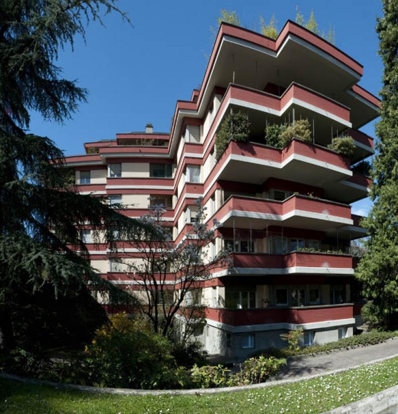 Gli atrii d’ingresso sono passanti e collegati con i percorsi esterni in asfalto rosso, a incorniciare un’ampia prospettiva sul verde esterno. La scala elicoidale, rifinita in marmo rosa chiaro (utilizzato anche per i pianerottoli), conferisce a questo spazio di distribuzione un senso di fluidità, accentuato dal parapetto, in tubolare di ferro dipinto di rosso, con i montanti di colore nero, che riprende il classico motivo curvo ricorrente anche in altre realizzazioni dei progettisti.