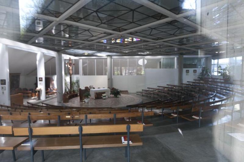 L’ingresso dell’aula liturgica avviene alla quota sottostante del sagrato. Un percorso a “L”, accessibile dalla quota superiore, divide la pianta in due spazi; quello principale in cui le sedute si dispongono a cavea, intorno all’altare coperto da un solaio piano sostenuto da strutture metalliche, e uno secondario, destinato alla cappella feriale, incassato all’interno del terrapieno artificiale visibile all’esterno. Quest’ultimo volume, dal profilo a scarpa, fa da contrappunto a quelli inclinati delle coperture dei due corpi accessori in precedenza citati che, insieme alla copertura piana della chiesa, realizzano una sorta di teatro/piazza all’aperto.