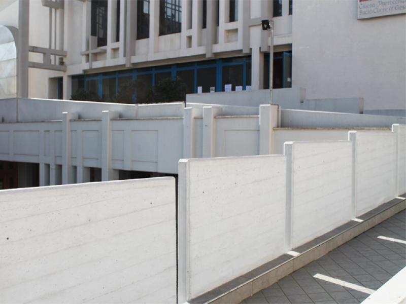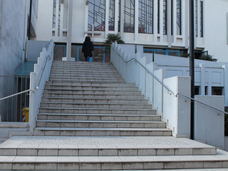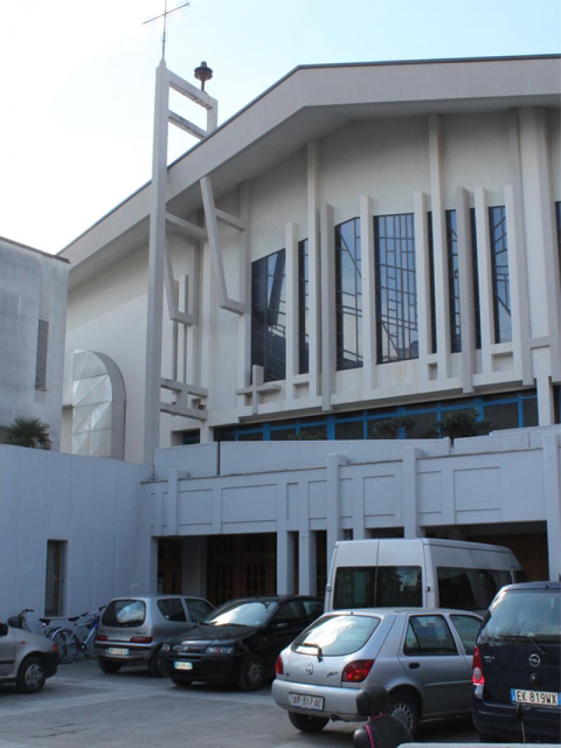 L’edificio, nella sua effettiva realizzazione, rispecchia in parte l’impostazione iniziale. Il fronte affaccia su una piccola via parallela al lungomare di Miramare e si presenta come un grande fabbricato assai differente dalle abitazioni circostanti. Sopraelevato rispetto alla quota stradale, vi si accede tramite una scalinata sul lato sinistro o percorrendo una rampa sul lato destro del prospetto principale. Sul prospetto destro dell’edificio è presente un’entrata secondaria, anch’essa fruibile tramite una scalinata. L’ingresso, non centrato, porta all’ampio interno caratterizzato da una pianta libera, interrotta solo dai 4 pilastri ad albero (altro riferimento ad elementi usati da Michelucci) che sorreggono la copertura. In corrispondenza dell’edificio, al piano terra, vi è la cripta alla quale si accede sempre dal fronte strada e la canonica. L’edificio è costruito interamente in cemento armato e rivestito da intonaco ruvido bianco e grigio con copertura a due falde. Nella realizzazione delle scale, delle rampe, dei parapetti e delle “decorazioni” in facciata, l’architetto utilizza alcune forme geometriche ripetute quali trapezi, rettangoli, quadrati, sempre in cemento rivestito. L’ingresso è costituito da una serie di vetrate opache con telaio di colore azzurro. Sopra l’ingresso è presente una grande vetrata, interrotta a tratti da elementi verticali in cemento armato che permette alla luce di penetrare all’interno. Sul fronte principale, un elemento verticale che sorregge una croce, percorre l’intera facciata dal basso verso l’alto. L’interno è caratterizzato da una luce soffusa, che entra dalle vetrate colorate e da un grande lucernaio posto al centro della pianta.