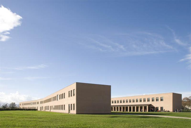 Da terra la scuola appare, nei propri corpi di fabbrica, come contenuta tra due grandi libri, uno per parte, affioranti dal territorio, che contengono gli spazi per la vita scolastica, generano il chiostro interno e le due grandi corti aperte.