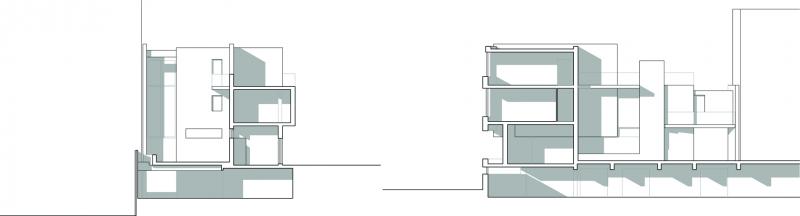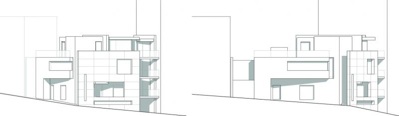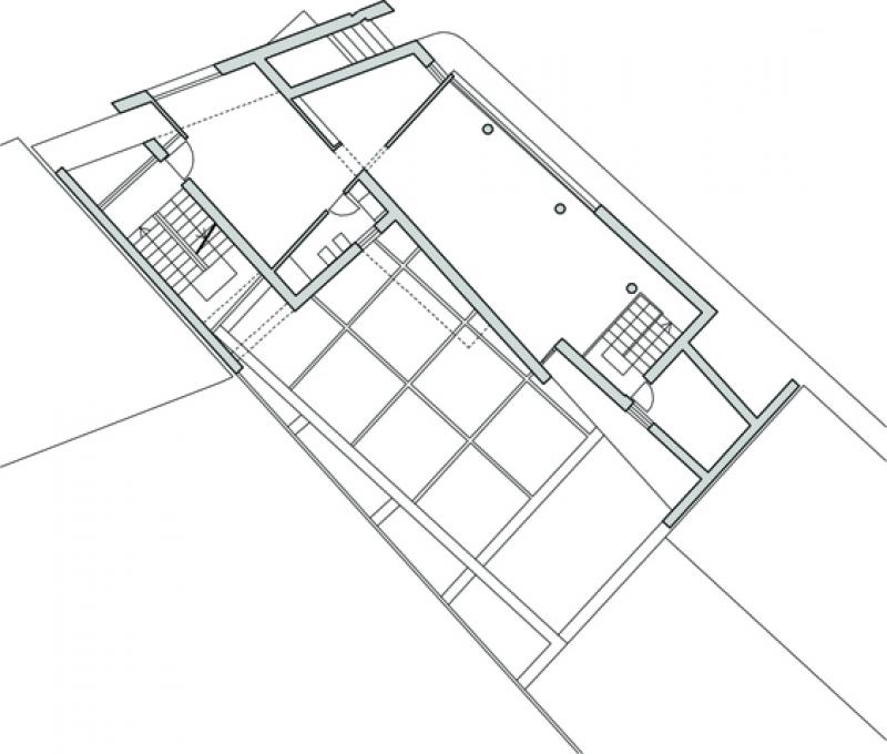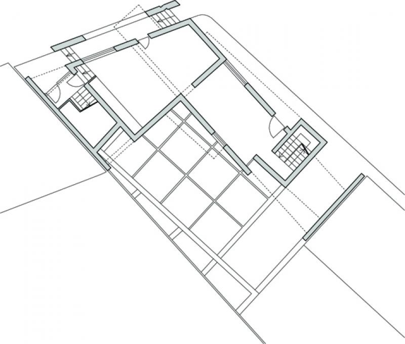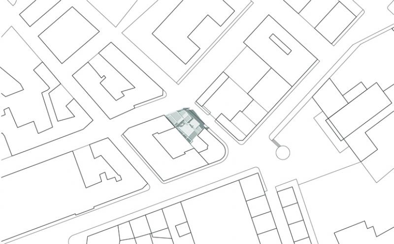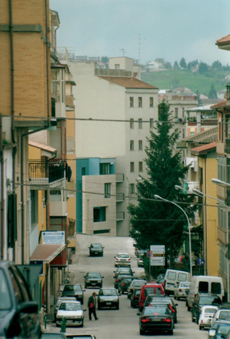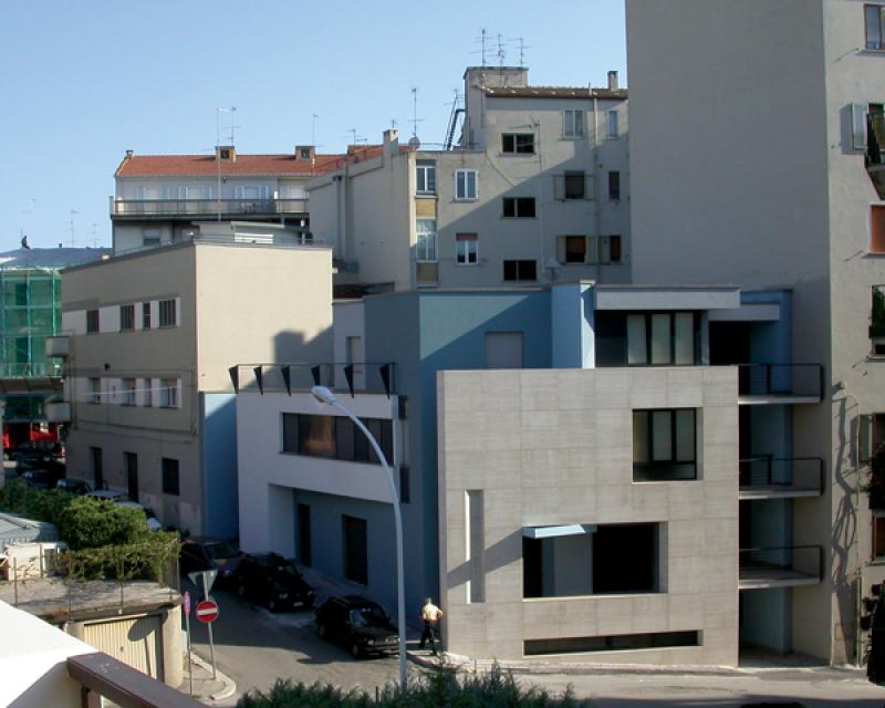 L’area di intervento è un vuoto urbano ubicato nel punto di contatto tra due tessuti edilizi: il primo consolidato dall’espansione dei primi del Novecento, l’altro ordito sull’impianto planimetrico razionalista del piano del 1942, redatto da Luigi Piccinato e Cesare Antonelli. Il progetto registra l’interferenza delle due trame urbane riproponendone i tracciati attraverso le principali direzioni della città (SO-NE e E-O) e la stessa propria configurazione geometrica, con l’intenzione di porsi come un frammento costruito che contenga l’informazione genetica del luogo e, allo stesso tempo, ne renda manifeste le dissonanze metriche e morfologiche. Il processo compositivo si basa su quattro considerazioni fondamentali, cui corrispondono precise operazioni sulla forma. L’edificio rappresenta la terminazione prospettica di un asse di accesso alla città, complementare a quello diretto in senso opposto, il cui fondale è la chiesa di S. Francesco. Questa particolare condizione suggerisce il posizionamento, all’interno della composizione, di un elemento che costituisca un punto di arresto per lo sguardo, ovvero l’isolamento morfologico e materico, sul fronte nord-ovest, di una quinta quadrata lapidea. Quest’ultima scivola nel terreno rivelando il corpo scala, trasparente, a stabilire continuità tra strada e corte. L’intersezione delle due giaciture dell’edificio è risolta attraverso l’estrazione di un frammento piano dalla superficie del setto longitudinale centrale che, sul lato interno enfatizza le proprietà tettoniche dell’intervento. La concatenazione di un nodo plastico costituito da due volumi a L contrapposte costituisce invece l’immagine che caratterizza il fronte nord-est. All'insufficienza della cubatura disponibile, che non consente di instaurare un rapporto volumetrico equilibrato con i fabbricati adiacenti, corrisponde infine la scelta di contrapporre alle due pesanti masse preesistenti due setti. Ne risulta una decompressione visiva ma anche una sorta di sospensione architettonica dell’edificio che sembra “farsi spazio” all'interno della città.