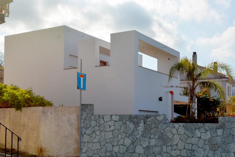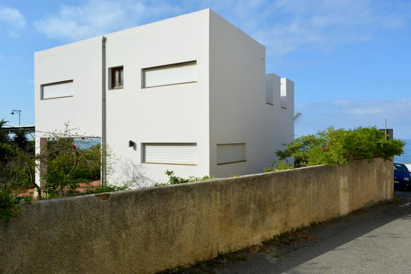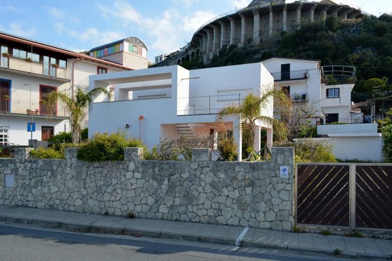 Per la sua “casa delle vacanze” il committente scelse un lotto accanto a uno scoglio naturale all’interno del territorio comunale di San Lucido, in provincia di Cosenza, posto alla fine dell’edificato esistente dirimpetto il litorale. La struttura della casa, formata da pilastri e travi, è ideata da Empio Malara in modo da comporre un cubo di 8 metri di lato per 6,60 metri di altezza, suddiviso in otto settori dove al piano terra, due sono dedicate alla zona del soggiorno, due alla stanza degli ospiti e al bagno e una alla cucina-zona pranzo. Uno dei vani che compone il soggiorno è privo di copertura e due pareti laterali. Al piano superiore, invece, sono tre le aree, destinate alle due camere da letto, al bagno e al terrazzo, disposte in modo da sfruttare la ventilazione naturale e da favorire il ricambio d’aria dal mare verso al montagna.