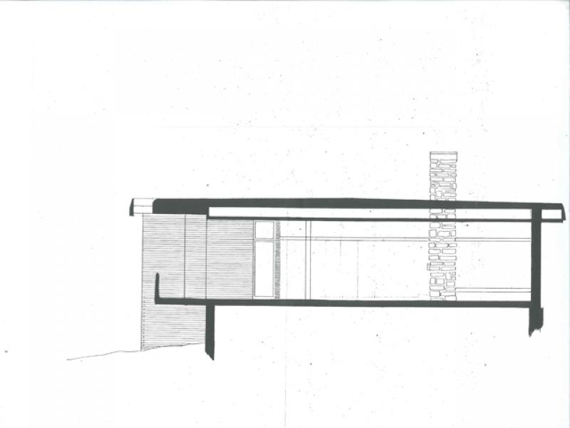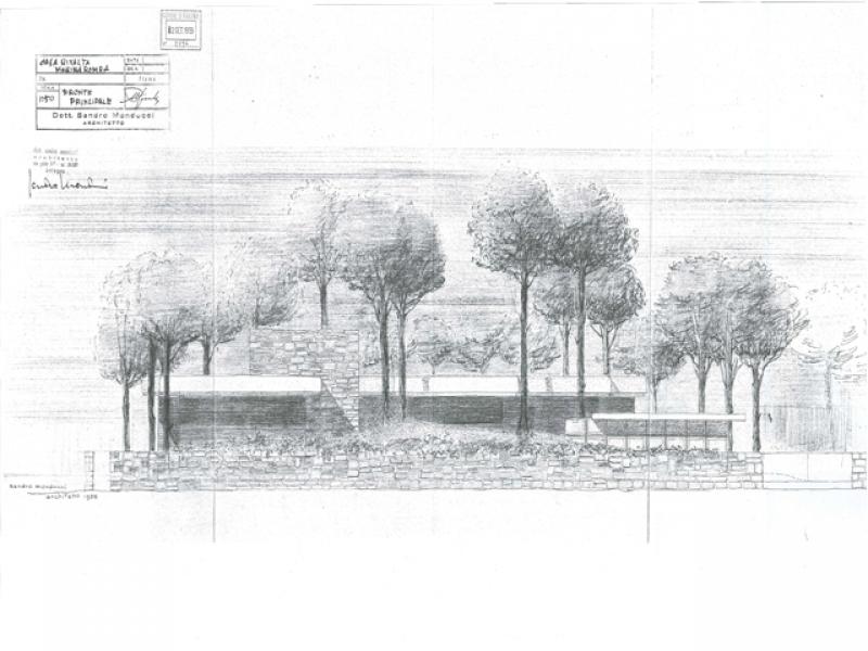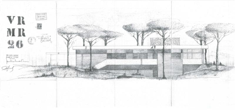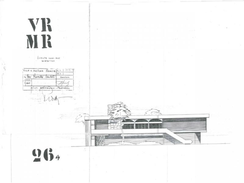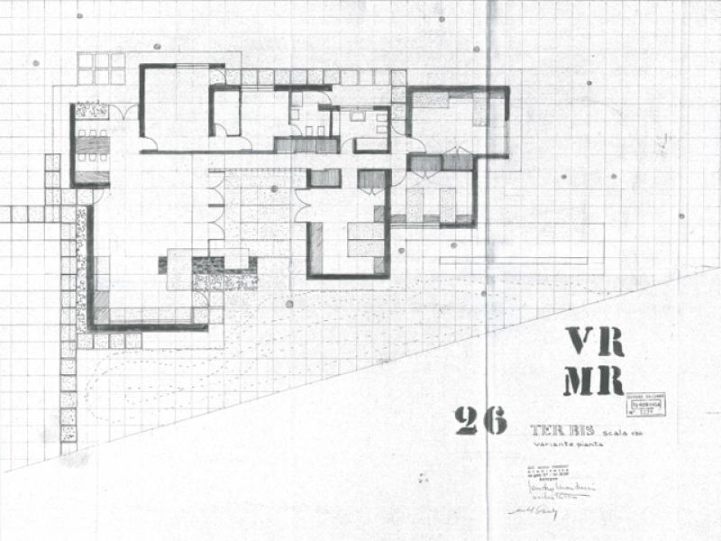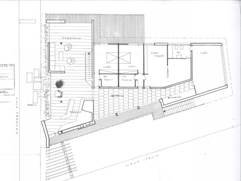Nel primo progetto, invece, la casa era di due piani, dalla pianta compatta e con una galleria vetrata che, affacciandosi sul balcone esterno, illuminava l’abitazione e metteva in comunicazione la zona del soggiorno con quella delle camere da letto, ognuna delle quali era provvista di bagno personale. Il primo piano era raggiungibile dall’esterno, da una scala che immetteva nel balcone, e dall’interno, da un’altra scala posta nella zona giorno.