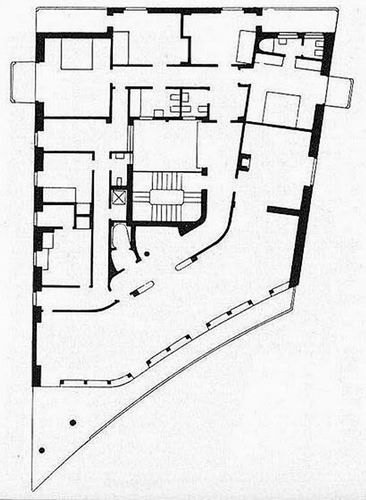 Il complesso, che si eleva per cinque piani più il piano d’ingresso, è composto da due volumi, l’uno contenuto all'interno dell’altro, indipendenti tra loro per forma e per logica progettuale: il volume interno, è trattenuto da un altro volume cavo sostenuto da una gabbia di pilastri e piani orizzontali, che ha il ruolo di facciata; quello interno invece è a forma di corte, ottenuta grazie all'accostamento di due blocchi ad “elle“: uno ad angolo retto, in cui si dislocano gli ambienti privati dell’abitazione, e quello che segue l’andamento curvilineo del lotto.