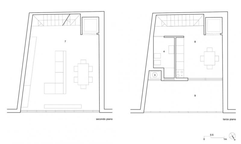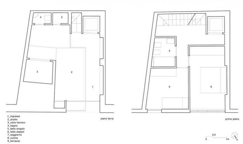 L’edificio, era costituito da tre piccoli ambienti e da un vano scala che conduceva al lastrico solare. La facciata, oltre ai due vani di ingresso a livello strada presentava due sole aperture di piccole dimensioni. Le caratteristiche distributive e morfologiche dell’immobile, insieme alla condizione precaria delle strutture ed alla necessità di sopraelevare, hanno reso opportuno un intervento di ristrutturazione edilizia consistente nella demolizione di una parte delle strutture interne esistenti, nello spostamento della scala e nella realizzazione di nuovi solai in latero-cemento. Non sono state, invece, apportate modifiche sostanziali al prospetto su strada per la parte a piano terra, a meno del ridisegno del vano di ingresso.