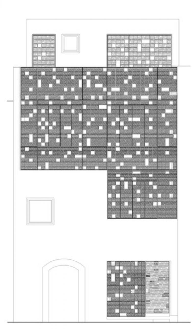 Il progetto si è basato sulla scelta di evidenziare l’intervento di ampliamento rispetto alla preesistenza attraverso il contrasto tra il volume in muratura intonacata al piano terra, reso formalmente autonomo rispetto alla parte nuova dell’edificio, e la nuova facciata, orientata a nord, si caratterizza per l’utilizzo di una doppia pelle: la prima, interna, consistente in ampie aperture vetrate; la seconda, esterna, costituita da un sistema di pannelli in mattonelle di legno su telai metallici, fissi ed apribili, aventi funzione di schermatura e protezione. Essi sono caratterizzati dall’alternanza casuale di pieni e vuoti, ottenuta dall’ingrandimento dei pixel di un’immagine digitale, e realizzati montando su telai metallici piastrelle in legno di dimensioni 15×15 cm.