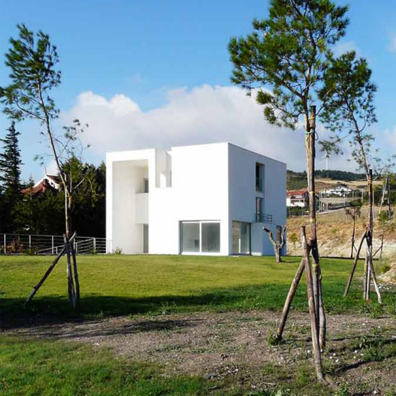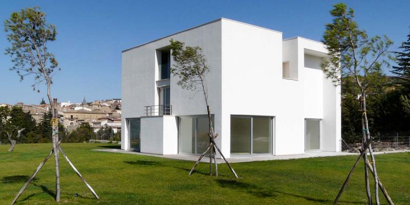 Si tratta di una piccola casa unifamiliare progettata dall’architetto Raimondo Guidacci per suo fratello e la sua famiglia ad Orsara di Puglia. Il progetto è frutto di un intenso rapporto di collaborazione tra committente e progettista (o più correttamente di lunghe lotte e discussioni tra fratelli). Si tratta di un volume molto semplice: un cubo bianco di dieci metri di lato, scavato nel suo volume iniziale; squadrato, geometrico, apparentemente astratto, ma in realtà simile a tante architetture del paesaggio circostante. Un volume semplice, elementare, in contrapposizione alle complesse ed articolate case circostanti. La casa, raggiungibile attraverso una lunga rampa pedonale, poggia su di un alto basamento rivestito in pietra di Trani. Una loggia a tutta altezza precede l’ingresso all’abitazione, il cui piano terra si apre, attraverso grosse vetrate scorrevoli, sul giardino circostante. Il primo piano, molto più chiuso e compatto, ospita le camere da letto. Il progetto cerca di reinterpretare, in chiave moderna, alcuni elementi tipici dell’architettura locale: come il muro in pietra a secco della campagna barese, o le candide case bianche finite a calce, di molti centri storici pugliesi.