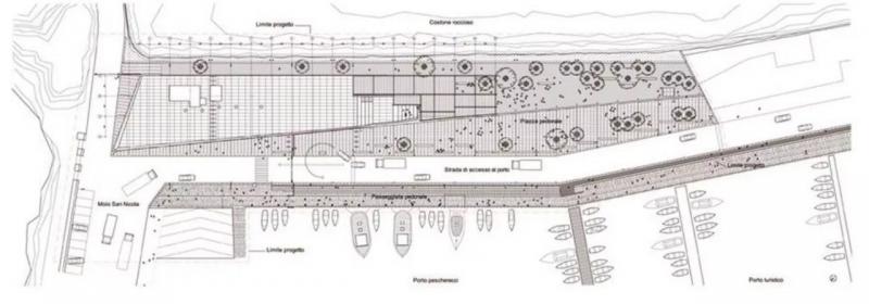 Le facciate nord-occidentale e nord-orientale sono aggettanti rispettivamente di 8° e 16°, con una soluzione che crea un segno caratterizzante, chiudendo la costruzione con una punta che si protende verso il mare. L'inclinazione, che contribuisce agli effetti di luce e ombra protegge gli ambienti interni dalla penetrazione della forte luce estiva, riflessa dal bacino del porto. Nel lato nord-occidentale sono inoltre inseriti gli accessi secondari, arretrati rispetto al filo dell'edificio e posti fuori asse rispetto alla perpendicolare, così da risultare, pressoché nascosti a una visione frontale. L'accesso principale - che introduce all'ampio atrio, illuminato grazie alla copertura vetrata inclinata - è affiancato da una gradinata che conduce al tetto dell'edificio e definisce uno spazio pubblico protetto da una pensilina con struttura in acciaio zincato e copertura di lamelle frangisole in lamiera forata. La pavimentazione della piazza retrostante è realizzata in pietra di Soleto, mentre quella della banchina e delle parti di collegamento in pietra Apricena; la scelta di tali elementi lapidei assicura la continuità con la città storica, mentre l'inserimento di essenze tipiche della macchia mediterranea lega l'intervento al paesaggio della pineta vicina.