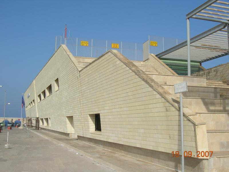 Inserito in un contesto fortemente connotato dal punto di vista storico e paesaggistico l'edificio si propone come estremo prolungamento verso il mare della linea dei bastioni cinquecenteschi disegnati da Francesco di Giorgio Martini. L'edificio (90x16 m circa) presenta un orientamento lungo l'asse SO-NE, ed è sviluppato su due piani destinati a uffici e spazi per la ricezione del pubblico. La struttura in cemento armato è rivestita completamente con pietra di Lecce, per la quale si è scelto un taglio a piano di sega (preferito a quello a punta di diamante che avrebbe reso la superficie liscia) per ottenere una superficie graffiata. L'estrazione della pietra da profondità differenti della stessa cava ha inoltre assicurato un gioco di sfumature e variazioni cromatiche, che in particolari ore della giornata viene esaltato dalla luce radente del sole.