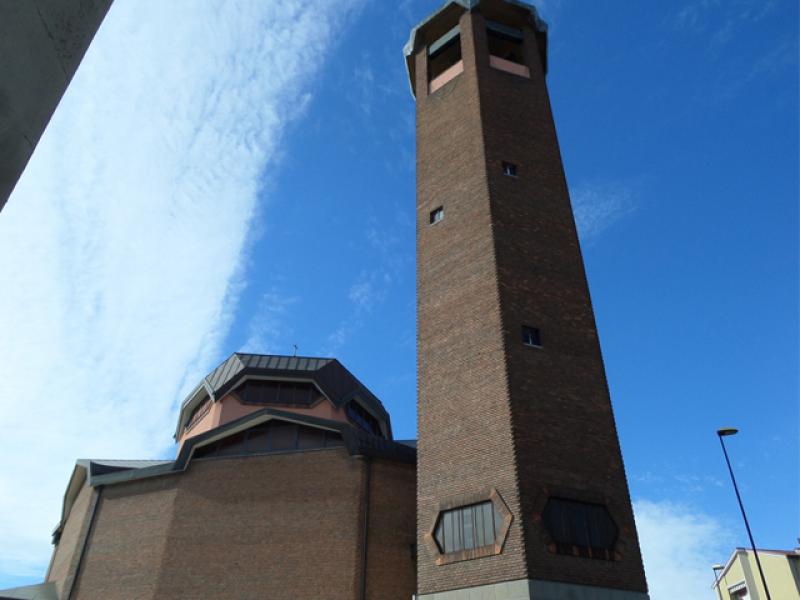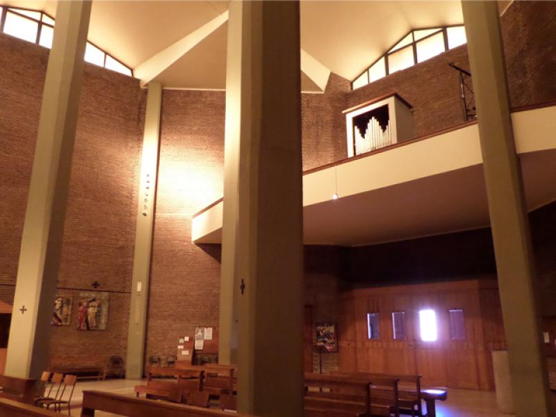 I muri portanti perimetrali in mattoni faccia a vista, presenti sia esternamente sia all'interno dell'ambiente liturgico, caratterizzano fortemente l’immagine compatta della chiesa, che si pone come un oggetto estraneo senza apparenti relazioni di continuità che la leghino al resto del contesto costruito.