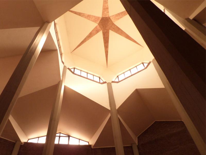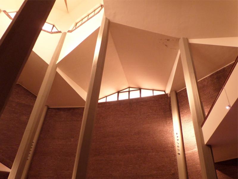 L'interno è illuminato dal tamburo forato e dalle finestrature che si aprono nel tatto di muro originato dallo sfalsamento del solaio di copertura, in modo da modulare l’illuminazione e creare un’atmosfera raccolta, appropriata allo svolgimento della funzione. La copertura si presenta, per differenza materica e formale, come elemento distinto dal resto del complesso, le cui caratteristiche plastiche sono determinate dalle potenzialità del cemento armato usato per la costruzione.