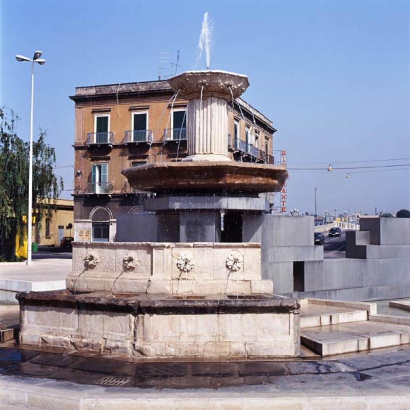 Risale al 7 giugno 1992 l’inaugurazione del progetto di riqualificazione di piazza Fontana a Taranto, concepito da Nicola Carrino, il quale dal 1983 iniziò a riflettere e a immaginare una riqualificazione dell’antica piazza della sua città natale, prospettando un intervento in stretto dialogo con il contesto urbano e la fontana lì conservata. Il riassetto della piazza assume, pertanto, un valore simbolico per l'importanza del luogo urbano, per il suo porsi come nodo di convergenze viarie e di rappresentatività come fosse l'accesso principale alla città per chi giunge dalla stazione ferroviaria. Si è trattato quindi di riattivare un luogo della memoria cittadina intervenendo con un elemento scultoreo significante per la contemporaneità (l'acciaio a Taranto) e integrando con esso i reperti architettonici dell'antica fontana ottocentesca (a sua volta memoria della originaria fontana cinquecentesca) ancora oggi esistenti, in una unitarietà scultorea e ambientale. Il disegno planimetrico della piazza è scandito sulle direttrici che partendo dal centro della stessa passano per i vertici o la metà dei lati dell'ottagono e del dodecagono, rispettivamente delle vasche e del basamento su una serie di cerchi in progressione che partendo dal centro della piazza determinano le misure della vasca piccola, della vasca grande e del basamento della fontana antica e quindi quelle della vasca nuova sul piano della piazza ed il limite della piazza stessa, creando nell'intersezione con le precedenti direttrici, un reticolo di riferimento formale e proporzionale. In tal modo elementi strutturali e linee percettive da questi determinate si irradiano dal centro verso le fabbriche delimitanti la scena della piazza e da queste ultime ritornano verso il centro, tendendo a riaggregare il tessuto urbano e spaziale dell'insieme. La scultura composta da 36 moduli L di 75x75x225 cm, è realizzata in acciaio inossidabile e misura nella totalità 2,25 m. in altezza per 21,10 m in lunghezza. l moduli sono assemblati tra loro a parete, con ampie aperture intervallate, ed alcuni sono dislocati sulla piazza e nella vasca al piano della piazza stessa. La scultura al centro della piazza si struttura ad angolo, sino a sostenere le vasche in pietra della fontana antica, svolgendo quindi funzione sostitutiva per la parte mancante del vecchio basamento. La scultura si dispone diagonalmente sulla piazza ricalcando l'andamento dell'originario condotto adducente l'acqua. La piazza è strutturata su 3 livelli ripartiti dalle direttrici predette e dispone come ulteriori presenze scultoree di 3 elementi di seduta in pietra a grande scala a forma di L.