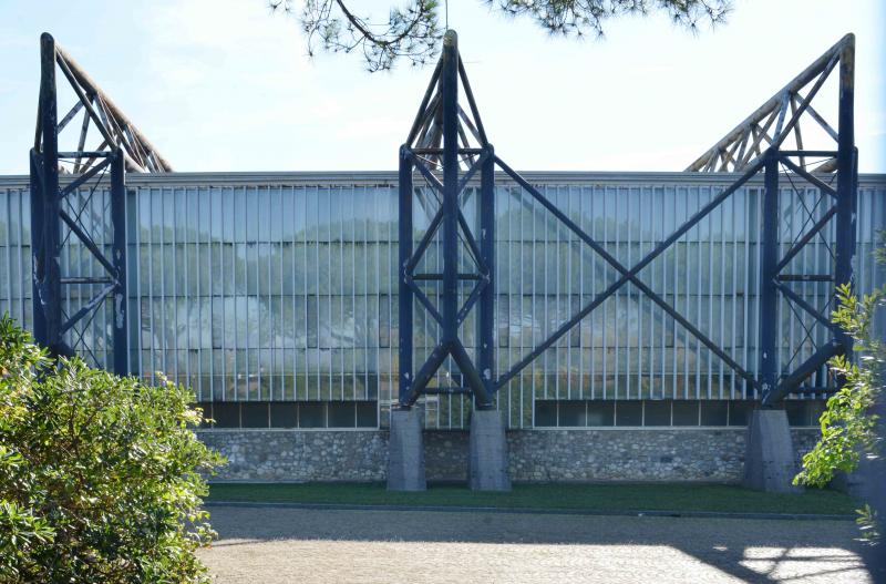 - Coperture: Maglia reticolare in acciaio per l’edificio espositivo; Travi reticolari triangolari, copertura in lamiera per l’edificio per servizi sociali