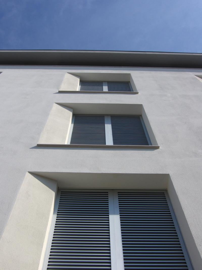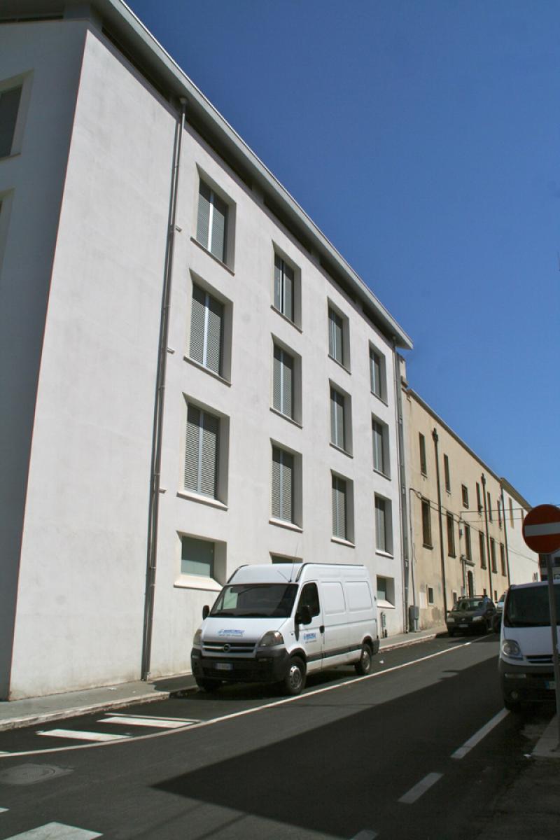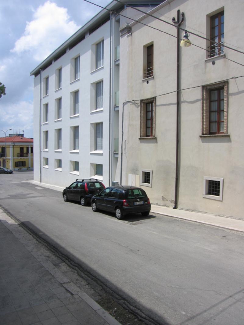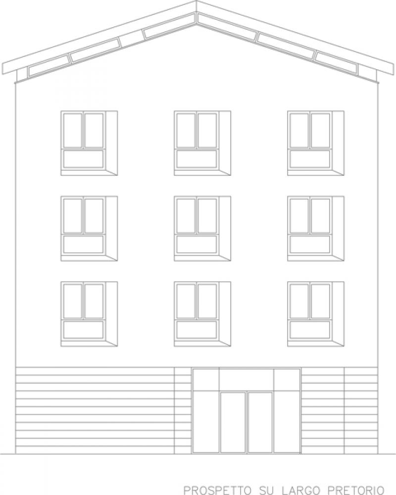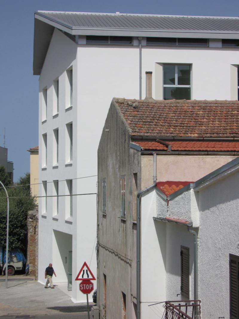 L'edificio nasce, in applicazione del DPR n. 380 del 6.6.01 di incentivazione alla sostituzione edilizia, come ricostruzione di un preesistente fabbricato colpito dal sisma del 2002 di cui recupera la presenza urbana con poche ma significative varianti che giustificano, pur nella continuità storica, la piena appartenenza al contemporaneo. Il progetto recupera il rapporto tra pieni e vuoti e riprende il disegno delle strombature dalla piccola chiesa posta a monte. La copertura è staccata dall'edificio attraverso un' asola vetrata che corre lungo il perimetro, reinterpretazione concettuale del cornicione, quale elemento di mediazione tra la parete e la copertura stessa. Allo stesso modo una cesura verticale, data da un arretramento della parete, segna l'attacco con l'edificio contiguo. La struttura in calcestruzzo armato in opera presenta luci fino a mt 10,50 tali da ottenere ampi spazi liberi.
