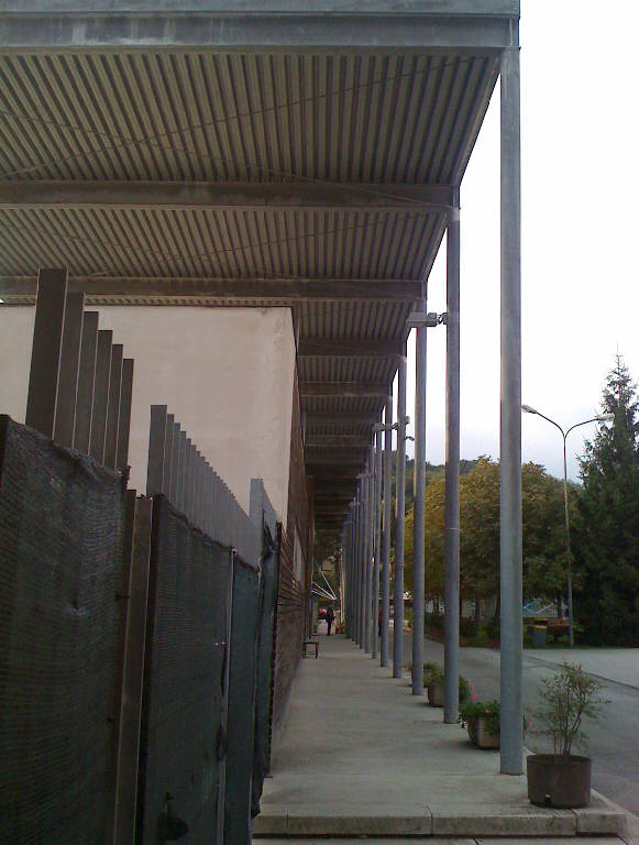 L'opera si presenta come un lungo corpo porticato a tripla altezza (circa sette metri), che espone verso strada una testata vitrea fortemente arretrata rispetto al filo della copertura. Il primo segmento del volume edificato si dispone su due piani, mentre oltre il varco di accesso al campo sportivo, circa a metà dello sviluppo longitudinale, la quota si abbassa a un solo piano. Sotto l'alta copertura sono radunati e unificati visivamente, grazie al ritmo del colonnato su ambo i lati, volumi di calibro e destinazione alquanto diversificata. Grande attenzione è posta infatti nel comporre in un blocco organico tali diversità, pervenendo a un'immagine complessiva coerente e accurata in ogni parte.