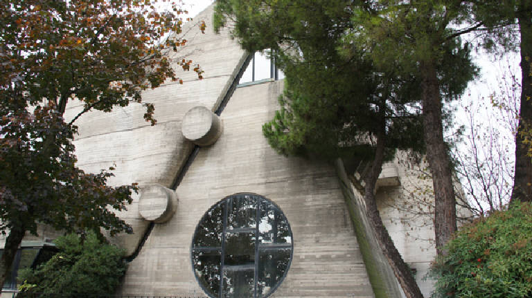 La sede della Cassa Rurale e Artigiana è una composizione di elementi piramidali e di piani orizzontali che permettono l'apertura di una serie di terrazze, collegate tra di loro da una scala elicoidale in cemento armato.