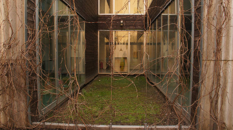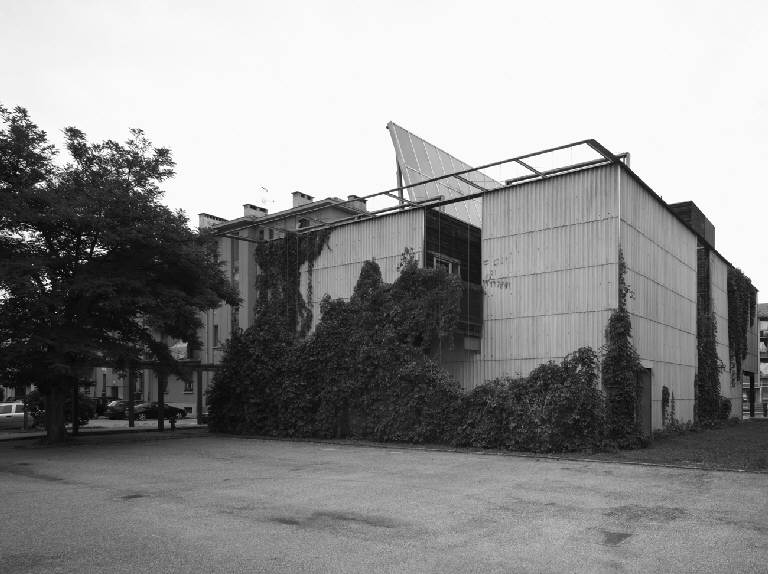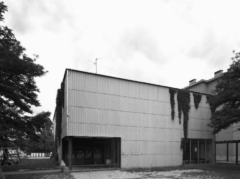 L'edificio, a pianta rettangolare su due livelli e in origine chiuso su tutti i lati da una cortina verde, si trova al centro di un impianto residenziale omogeneo su modello della città-giardino. All'interno della costruzione le partizioni sono ricavate per detrazione di quattro patii e con l'inserimento di due blocchi, il primo dei servizi, il secondo dei collegamenti verticali. La facciata, nell'intenzione degli autori rivestita di rampicanti, oltre a richiamare una possibile fusione tra natura e architettura aveva anche una valenza relativa al comfort ambientale interno, costituendo uno sistema ombreggiante naturale. Anche i patii sono pensati nell'ottica del risparmio energetico, costituendo dei condensatori e accumulatori di aria fresca che va a circolare dentro l'edificio nel periodo estivo, mentre in inverno si ha modo di beneficiare dell'apporto solare passivo. All'interno, il piano terra è concepito come ambiente unico scandito dalle volumetrie opache dei servizi e dei collegamenti verticali e dal volume diffusore di luce del patio a tutta altezza. Al primo piano le divisioni spaziali si fanno più nette, i patii si moltiplicano compensando l'assenza di affacci sull'esterno, preservando gli spazi dal rumore esterno.
