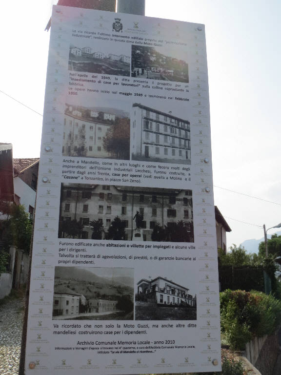 La fabbrica Moto Guzzi è andata caratterizzando dal 1921 lo sviluppo urbanistico e industriale di Mandello e negli anni successivi alla Seconda Guerra Mondiale è tra le naturali destinatarie del Piano INA Casa, che interessa vari Comuni del lecchese. Il lecchese infatti, precoce area di sviluppo industriale in Lombardia, ospita fin dal suo nascere la politica di edilizia residenziale pubblica sostenuta dallo Stato e gestita dall'Istituto Nazionale delle Assicurazioni (INA), sancita con la legge 43 del 1949, chiamata Piano INA Casa. Il Piano, inizialmente con durata settennale, venne replicato per un altro settennio ed ebbe il duplice effetto di incrementare l'occupazione operaia e di agevolare la costruzione di case a basso costo, circostanze entrambe di grande momento per l'epoca. Al di là di critiche più o meno giustificate sui risultati architettonici e urbanistici -spesso modesti- dei quartieri popolari, l'esperienza INA Casa ebbe indubbiamente un impatto positivo sulla società italiana e sulla cultura architettonica e tecnica in generale, mobilitando le migliori energie su tutto il territorio nazionale.