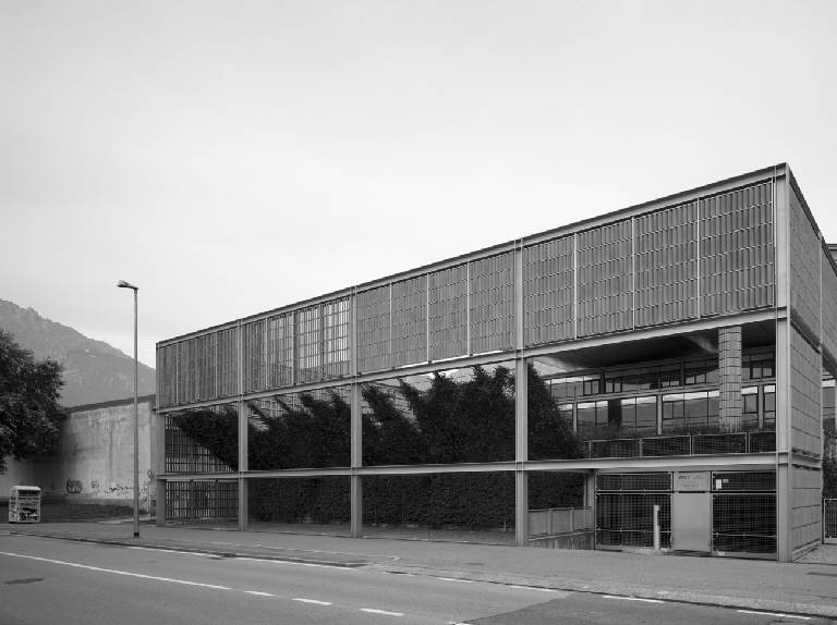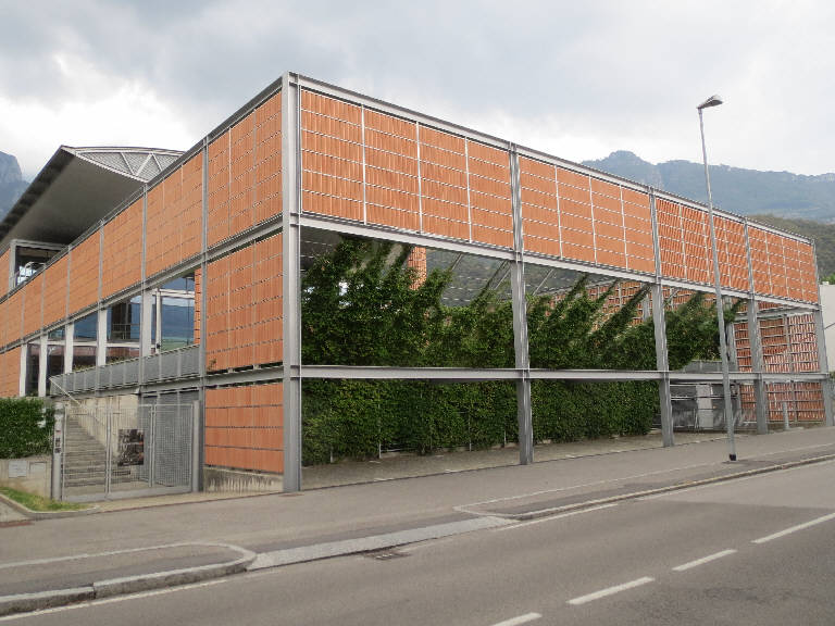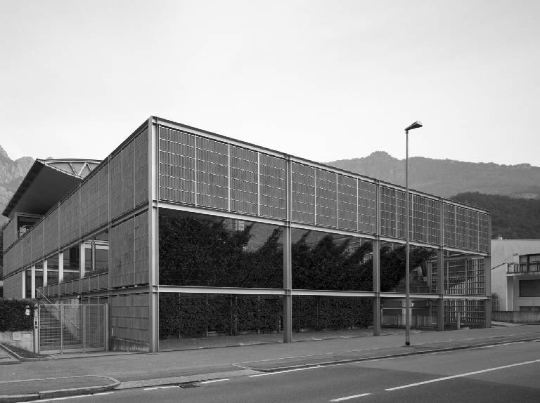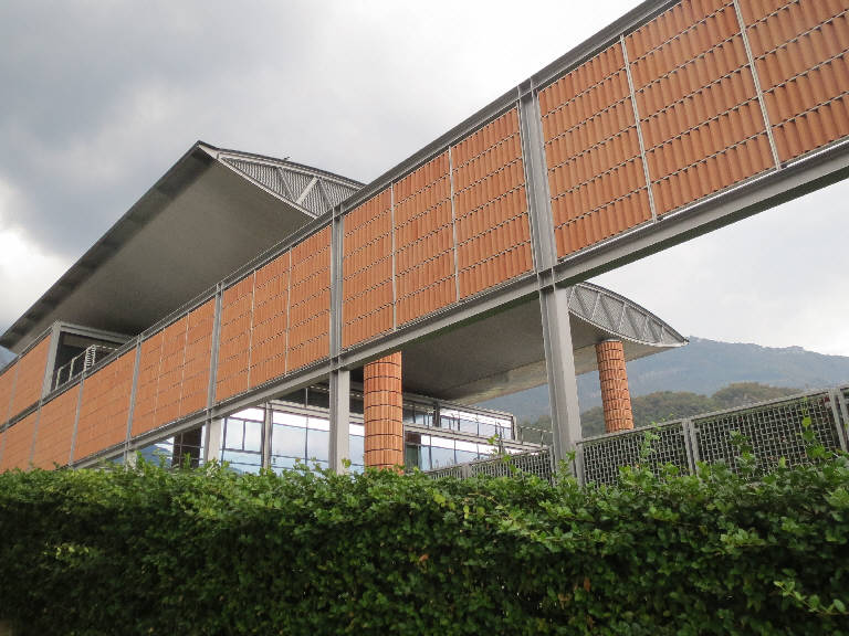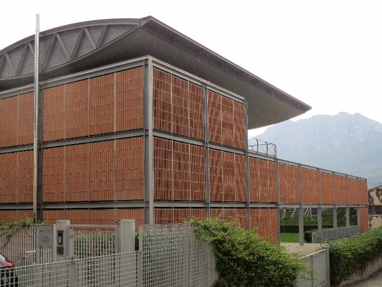Il volume costruito si colloca sullo sfondo di questa hall a cielo aperto e sfrutta il modesto dislivello tra la via di affaccio e la parallela a monte del lotto per articolare anche in alzato un razionale assetto distributivo: alla quota più bassa parzialmente interrata i 60 posti auto, l'archivio e i locali tecnici; dalla più alta (il terzo piano) una terrazza coperta consente la vista dei monti e del lago, mentre la commistione tra utenze che esprime la mission dell'Associazione trova spazio: al piano terreno, sovrastato da una spettacolare copertura a doppia altezza che sembra sorgere dalla corte, con un'area di accoglienza, un open space operativo e una grande sala convegni; al primo piano con uffici e spazi di incontro per utenti dei servizi dell'associazione; al secondo infine con uno spazio per mostre ed eventi.
