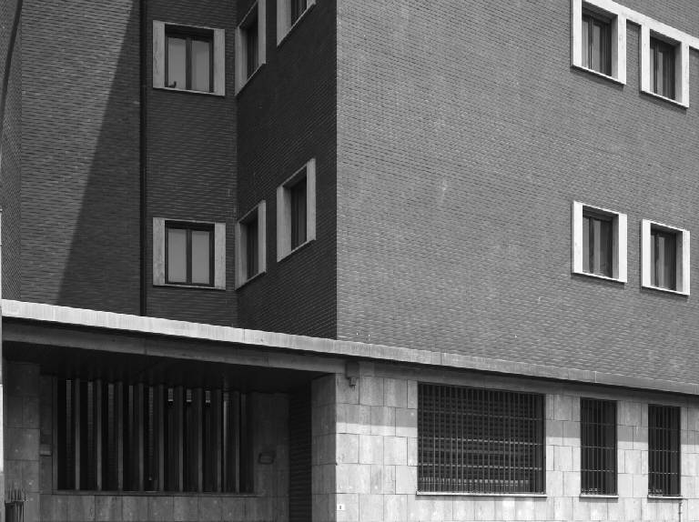 I punti di connessione tra i blocchi sono segnati dalle fronti arretrate su cui si attestano gli ingressi, che costituiscono quindi un punto di rottura nella continuità delle facciate.