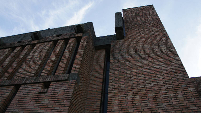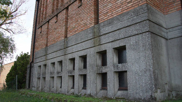 A pianta composita, l'edificio reinterpreta l'architettura delle fortificazioni cinquecentesche, mediante la compattezza delle murature in mattoni a vista che si ergono sopra un alto basamento in cemento armato, interrotte da sottili aperture verticali lungo il perimetro.