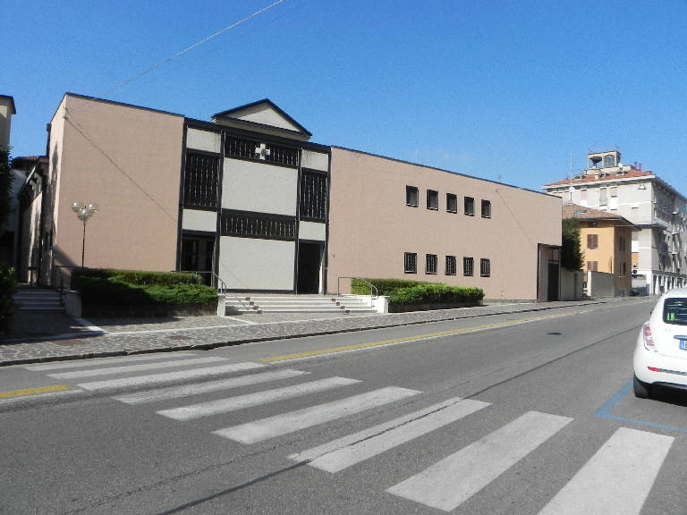 La cappella fa parte di un vasto complesso gestito da una congregazione religiosa, che comprende anche una casa di riposo per anziani. Il progetto di Dino Nicolini si assesta sul sedime di una struttura appartenente appunto alla congregazione, creando un nuovo fronte stradale e inserendo i corpi funzionali. Al fine di creare un piccolo sagrato l'edificio viene inclinato rispetto al filo stradale: la facciata è un fronte compatto, in pannelli intonacati, mentre il portale è risolto con l'utilizzo di un telaio brunito che organizza, in modo assolutamente simmetrico, pannelli intonacati e grigliati metallici. In sommità un timpano modanato segnala la presenza dell'edificio religioso, riconoscibile nella sua funzione anche per la sobria croce greca incastrata nel pannello grigliato.