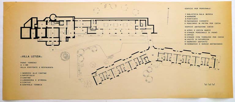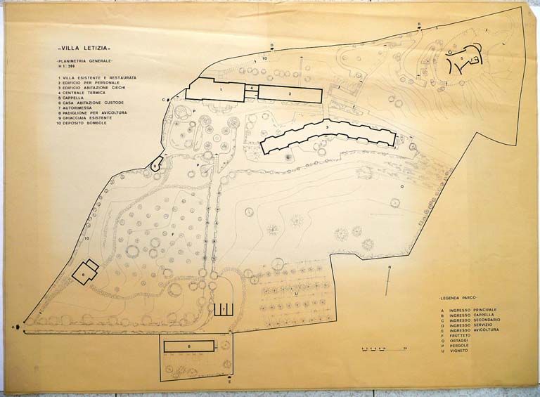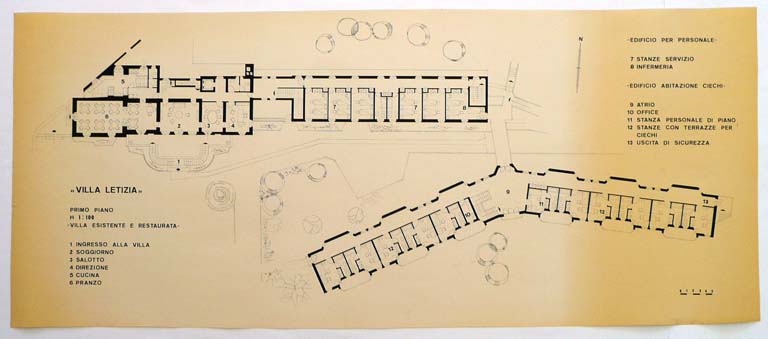 L'intervento di Baldessari ha riguardato la ristrutturazione di un complesso esistente - la Villa Letizia, adibita a casa di cura per non vedenti - e la realizzazione di tre nuovi edifici: un ampliamento riservato al personale, un nuovo volume per le stanze di degenza e la cappella di Santa Lucia, costruita isolata su un'altura del parco. L'ala per il personale viene posta in adiacenza alla villa e, al piano terra, ospita una biblioteca e una sala musica da cui, attraverso un passaggio coperto, si accede al corpo delle nuove stanze. Costituito da due bracci leggermente inclinati l'uno rispetto all'altro, a formare una V, e ancorati intorno a un nucleo centrale di servizi da cui partono i percorsi distributivi in linea, questo edificio si sviluppa su due livelli fuori terra, orientati sulle colline e sul verde circostante a cui le camere si rivolgono, attraverso logge private.