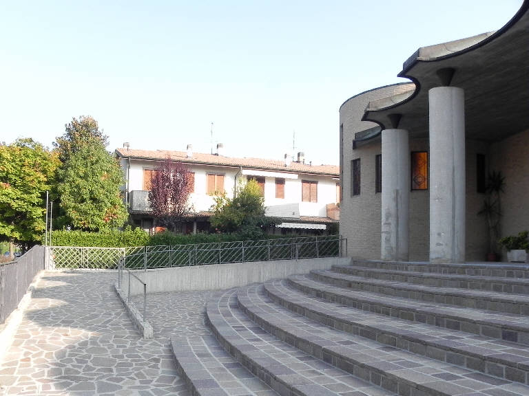 Di impianto pienamente post-conciliare, ovvero improntata a una libera reinterpretazione del tipo edilizio, la chiesa ha pianta ellittica affiancata su ambo i lati del fronte di accesso da due corpi cilindrici destinati l'uno al battistero, l'altro alla penitenzieria (il luogo dei confessionali); un ellisse minore definisce l'area del presbiterio, leggermente rialzata rispetto alla sala di preghiera. Alte feritoie provvedono a far filtrare la luce dalle due nicchie cilindriche, mentre il dislivello tra il corpo centrale dell'aula e i corpi accessori crea un "tamburo" forato da una sequenza regolare di piccole finestre, da cui la luce piove suggestivamente verso il basso. Un finto matroneo su tre livelli - riferimento simbolico alla Trinità - perimetra l'aula principale, sorretto da dodici colonne - riferimento simbolico agli Apostoli. I materiali impiegati, il legno e il cotto, si riallacciano alla tradizione lodigiana. Il cotto rosato riveste le facciate esterne, mentre in legno - nella contemporanea versione lamellare - sono le tre grandi travi che sostengono il soffitto. Nell'interno i rivestimenti sono in pietra calcarea e, a pavimento, passatoie di granito convergono sull'altare, a rimarcarne il ruolo centrale nella liturgia.