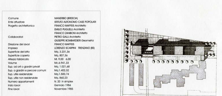 L'intervento è il risultato di un concorso-appalto per il progetto e la realizzazione di un complesso insediativo residenziale nel Comune di Manerbio (BS), bandito dallo IACP all'inizio degli anni '80. Franco Maffeis nasce a Milano nel 1947, nel 1971 si laurea in architettura presso il Politecnico di Milano. Titolare dello studio omonimo ad Orzinuovi (BS) svolge attività professionale nel campo dell'edilizia pubblica e privata. Ha svolto il ruolo di coordinatore generale per lo studio Gregotti Associati International.