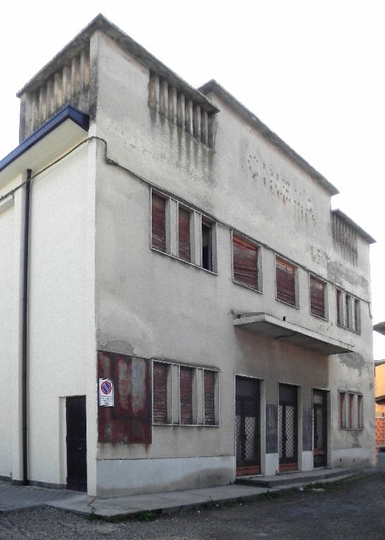 L'edificio è alquanto modesto: un parallelepipedo a due piani intonacato e forato da aperture accuratamente composte e dotate di avvolgibili oscuranti, una liscia facciata che termina verso l'alto con un saliente centrale alleggerito da due brevi balaustre; la parola "CINEMA"(ora rimossa lasciando evidenti tracce), senza ulteriore specificazione, rivela che all'epoca si trattava dell'unico cinema del paese. Il linguaggio architettonico è ancora intriso del Moderno che, negli anni della guerra, si era come cristallizzato nelle sue forme; la sperimentazione progettuale proiettata verso un'attenzione alle "preesistenze ambientali" stava dando i primi frutti solo nei centri più dinamici del Paese.