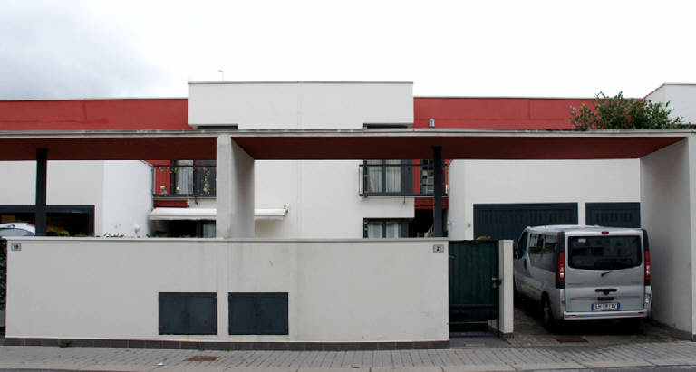 Tutti gli edifici, disposti lungo una maglia ortogonale, sono costituiti da parallelepipedi con facciate intonacate in bianco o color mattone, ampie finestrature oscurate con brise soleil lignei e tetti piani.
