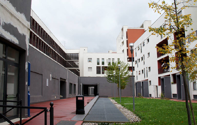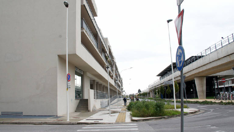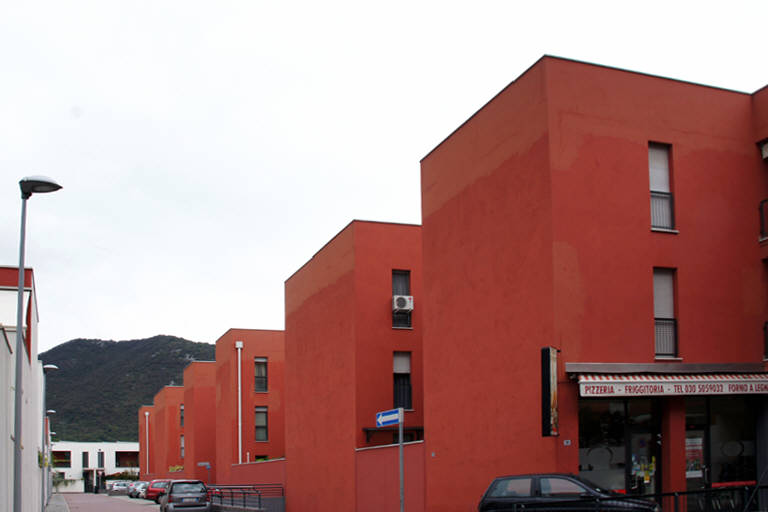 Il confine edilizio lungo via Bazoli, l'asse viario principale, è risolto con lunghi corpi di fabbrica in linea, in cui sono collocati gli spazi commerciali e di servizio al piano terra, resi permeabili all'interno degli isolati mediante passaggi porticati.