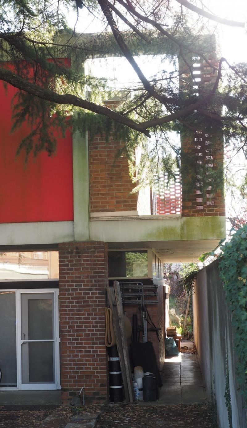 La casa è costruita su un piccolo lotto molto alberato. La struttura a telaio in cemento armato ingloba alcuni alberi preesistenti. Si entra nella casa attraverso il patio sul quale si affaccia il soggiorno e la scala in ferro, vetrata su tutta altezza. Lo spazio interno è caratterizzato dall’opposizione tra la rigida struttura dei massicci pilastri in mattoni e le pareti usate come quinte, vetrate o piene, in un continuo gioco di rapporti di trasparenze e visioni negate tra esterno e spazi interni. Al piano superiore la casa si svuota ulteriormente: un ampio terrazzo viene ricavato dal telaio della struttura.