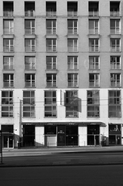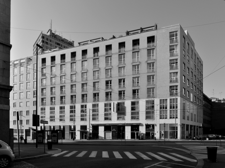 - Materiale di facciata: marmo Perlino bianco (basamento fino al secondo piano); litoceramica