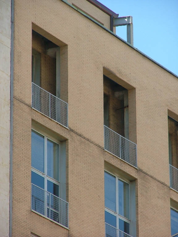 - Serramenti: in alluminio anodizzato (fino al secondo piano); in legno di rovere a battente verticale (piani superiori)