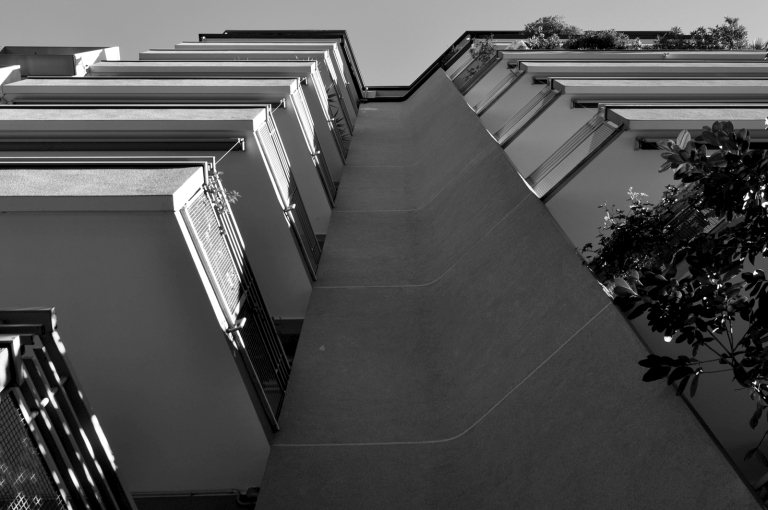 La zona giorno e le camere da letto si aprono invece su due balconate (lunghe cinque e sette metri) che sbalzano di oltre 230 centimetri dal filo della facciata rivolta a viale Piave. Concepite dai progettisti come vere e proprie stanze all'aperto, sono schermate a nord da muri portanti inclinati a quarantacinque gradi rispetto alla giacitura planimetrica principale. In questo modo il blocco edilizio assume diversa conformazione a secondo del punto da cui lo si osserva: se visto da nord, appare come un volume chiuso dai netti chiaroscuri; se visto da sud, si apre attraverso le ampie porte-finestra con apertura a fisarmonica che danno sulle terrazze.