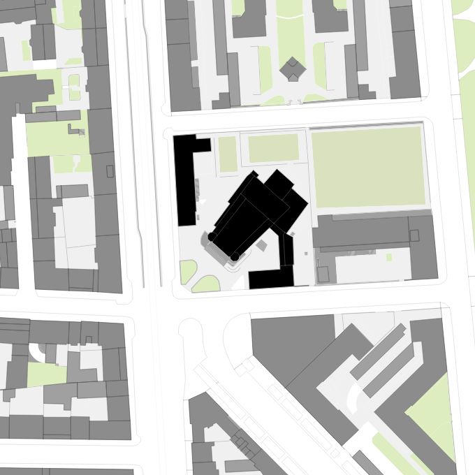 Le dimensioni ridotte del lotto, posto ad angolo tra le vie Pezzotti e Carcano, hanno spinto Muzio ad adottare un sistema planimetrico in cui il corpo della chiesa è arretrato e orientato di quarantacinque gradi rispetto alla giacitura degli assi stradali. In questo modo si genera uno spazio, in parte a verde pubblico, che funge da filtro con la città e da sagrato per il complesso, le cui ali sono invece orientate secondo la maglia viaria.