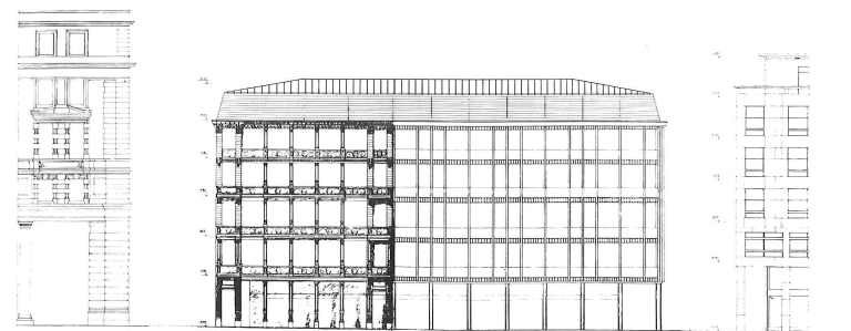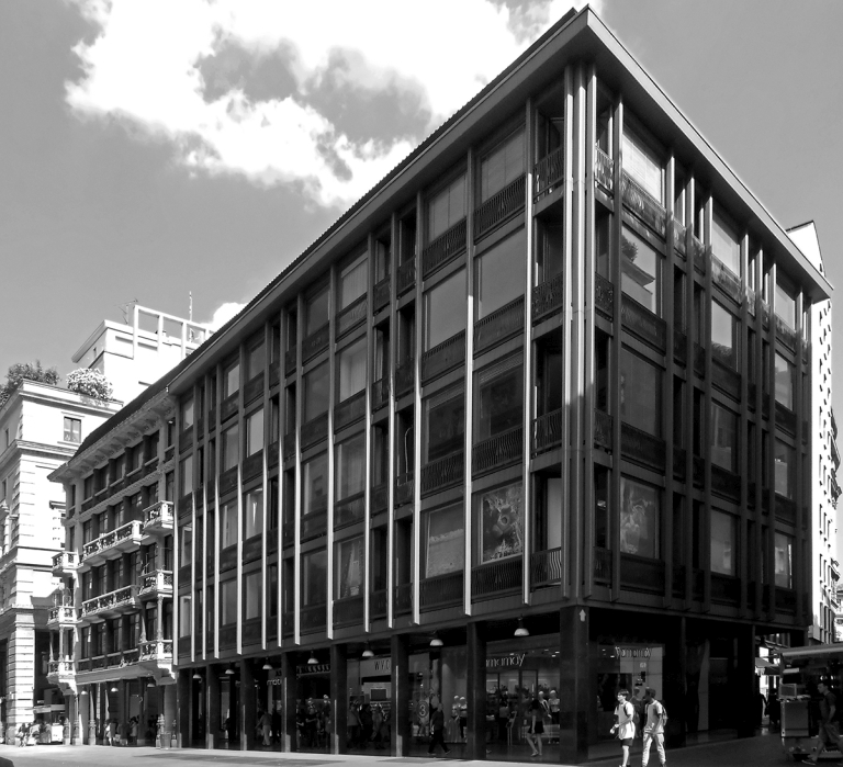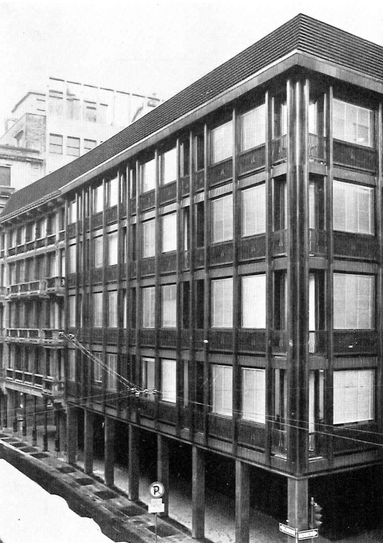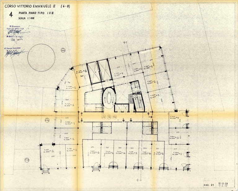 L'edificio, commissionato dalla società Beni Immobili e affacciato sul prestigioso corso Vittorio Emanuele II, presenta diversi aspetti di interesse dal punto di vista architettonico, tipologico e funzionale. L'iter progettuale inizia nel 1952 con i primi disegni ad opera di Giovani Muzio, al quale si affiancherà in seguito il figlio Lorenzo, e si conclude nel 1965 con la realizzazione di un'architettura che è frutto di una lunga serie di proposte, modifiche e varianti in corso d'opera. La Commissione Igienico Edilizia del Comune di Milano approva gli elaborati di progetto nel 1963: le tavole, datate 1959, rappresentano un edificio sostanzialmente fedele, ad eccezione di alcuni dettagli, a quello realizzato, dotato di sei piani fuori terra e il cui ingombro occupa l'intero isolato tra le vie Cesare Beccaria e della Passarella. Il prospetto principale è caratterizzato dalla singolare presenza di un tratto della facciata liberty appartenuta a un palazzo preesistente danneggiato dai bombardamenti bellici - i Magazzini Bonomi (1902-1907) - che la Soprintendenza aveva imposto di mantenere: una soluzione certamente non comune, che connota fortemente il fronte sul corso e ne stempera l'impatto moderno.