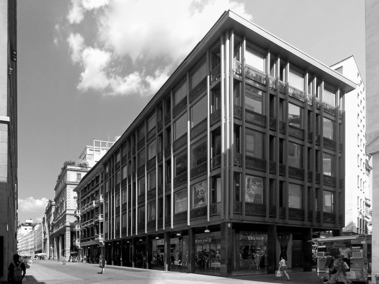 La cortina edilizia di corso Vittorio Emanuele II - l'antica Corsia dei Servi - in cui si inserisce l'edificio Beni Immobili realizzato dallo studio Muzio tra il 1952 e il 1965 viene in larga parte ricostruita negli anni del dopoguerra. L'aspetto del corso, oggetto di molte vedute ottocentesche e di fotografie storiche, è oggi radicalmente mutato dopo i danni dei bombardamenti bellici della Seconda Guerra Mondiale. L'intervento di Giovanni Muzio ingloba il preesistente fronte dei Magazzini Bonomi costruiti dall'ingegnere Angelo Bonomi tra il 1902 e il 1907: un notevole esempio milanese di liberty maturo, dove ai tipici elementi decorativi floreali vengono integrate soluzioni strutturali d'avanguardia per l'epoca, come i pilastri in ferro a vista che consentivano di ottenere un piano terra libero da ingombranti setti strutturali. Al piano interrato era presente un teatro, mentre i restanti piani erano destinati agli esercizi commerciali del grande magazzino e a uffici. L'edificio Beni Immobili inaugura molte soluzioni che diverranno tipiche del lavoro di Giovanni Muzio durante gli anni Sessanta, dove l'impiego di sistemi di facciata in rame, bronzo ed altri elementi metallici è assai frequente: a questo proposito possiamo citare il ridisegno dell'isolato del Credito Italiano (1963) in via Tommaso Grossi, San Protaso e Bassano Porrone, l'edificio tra le vie Borgonuovo e dei Giardini (1965) oppure, relativamente ad alcune sue parti, la più nota Torre Turati (1963) in piazza della Repubblica.