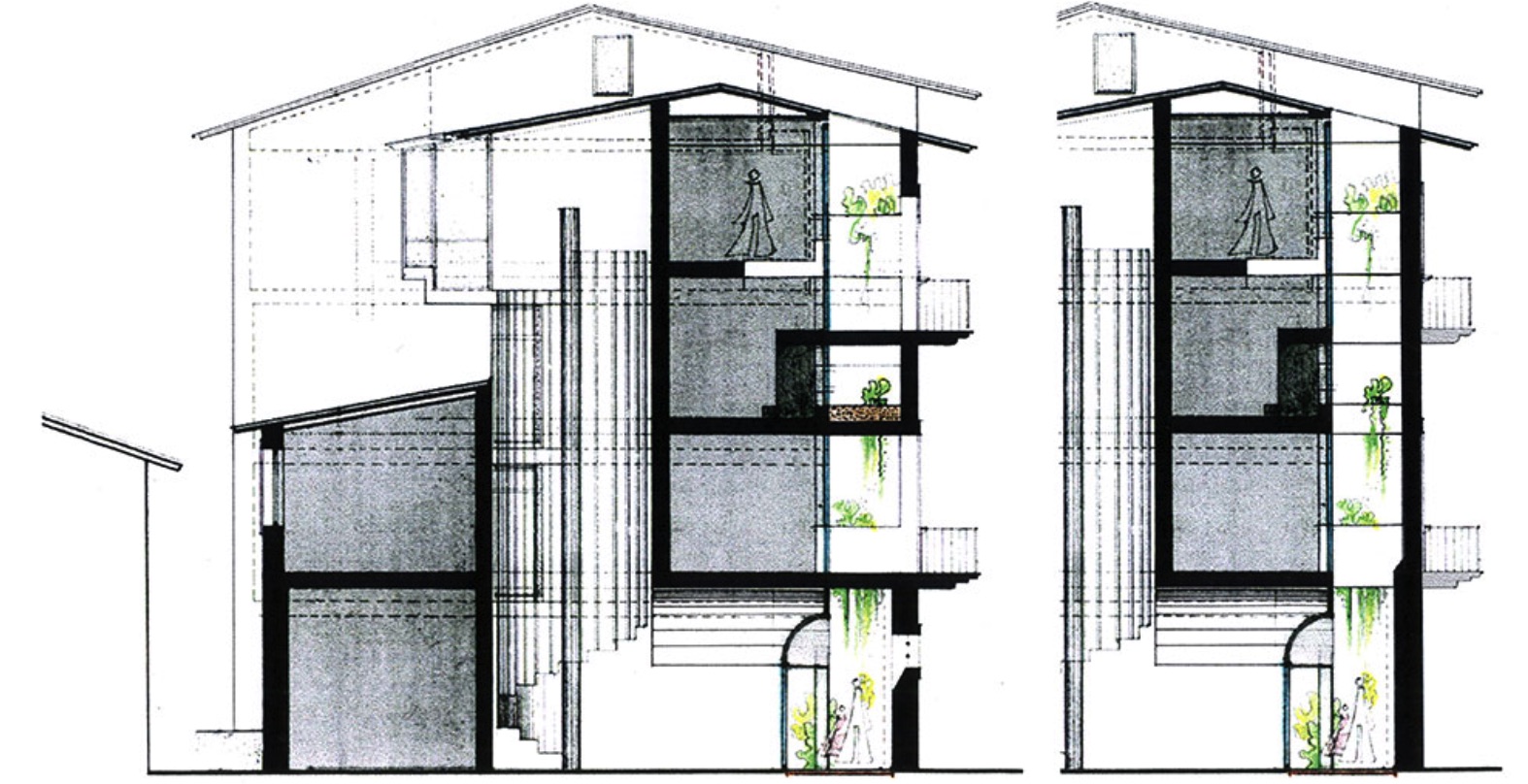 Il progetto interviene su un edificio medievale in muratura di travertino: l’intervento ha lasciato inalterato il fronte dell’edificio su Rua dei Della Torre, ricostruendo completamente l’interno con una struttura a telaio in cemento armato. La struttura originaria e quella nuova sono distaccate nel fronte verso la strada di circa 1,5 metri creando così uno spazio a tutta altezza fino alla copertura che porta la luce naturale agli appartamenti; in questo spazio si collocano delle passerelle di collegamento con le finestre e i balconi presenti nella facciata medievale. (FP)