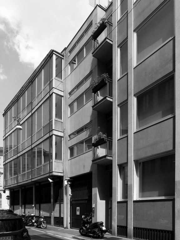 Dell'intervento esistono diverse varianti progettuali: pur adottando il medesimo programma volumetrico, alcune di queste proposte rinunciano al tema della griglia razionale per presentare un più ordinario fronte impostato sulla riproposizione della finestra a nastro. Significativo era certamente il porticato collocato a filo dei due corpi laterali, non realizzato, che doveva assicurare la continuità lungo il confine del lotto del fronte sulla piazzetta. La mancata realizzazione di questo elemento architettonico, sostituito da una più ordinaria cancellata in ferro, priva l'edificio di un più interessante e complesso rapporto con la forma dell'isolato. A testimonianza dell'importanza di quest'opera nella più vasta produzione architettonica dell'architetto comasco c'è una lettera, scritta da Lingeri stesso nel 1968, l'anno della sua scomparsa, dove egli testimonia il grande impegno profuso per la realizzazione di questa architettura assieme alla più nota sede degli uffici De Angeli Frua in via Paleocapa. Dal 2017 l'edificio è oggetto di un programma di riconversione nel primo W Hotel di Milano. Il progetto è a cura di Asti Architetti con Artelia Italia e Proges Engineering con interni dello Studio Urquiola. La parte posteriore dell'edificio è stata modificata e ampliata.