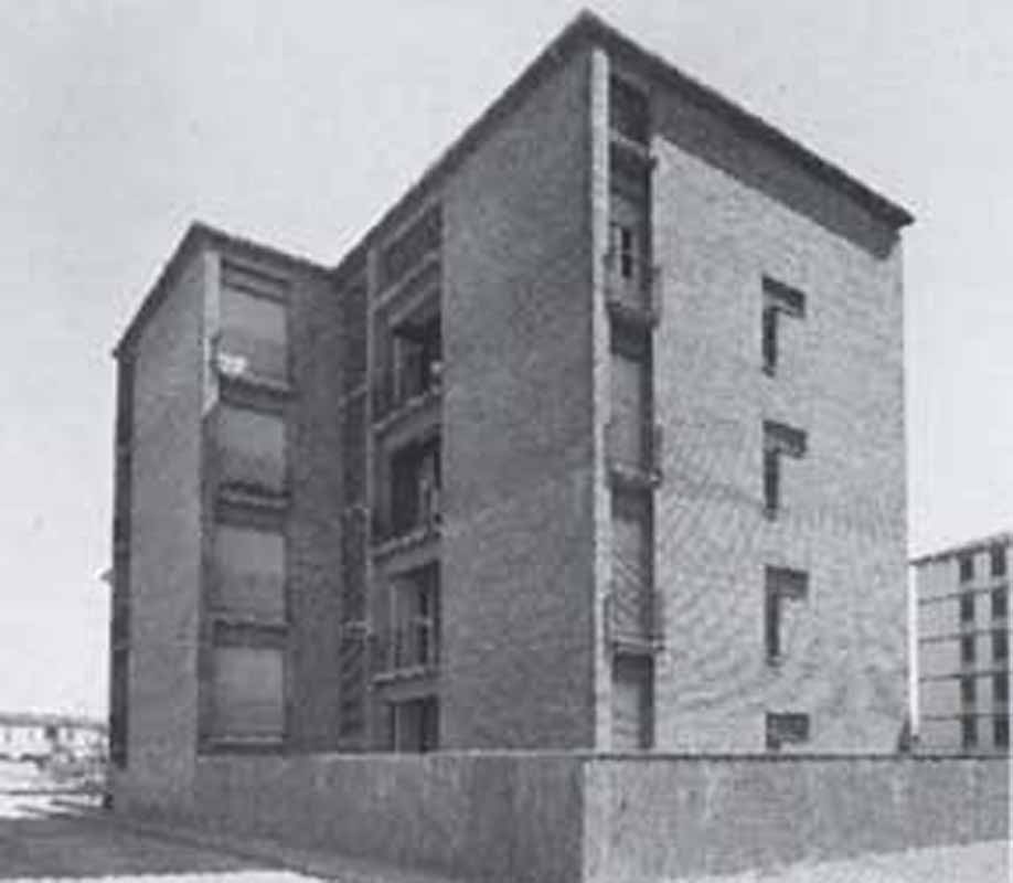 La parte dell’insediamento Ina-Casa progettata da Fagnoni - distinguibile per la libera disposizione degli edifici nel verde - è composta da edifici in linea o a blocco isolato, caratterizzati da una continua variazione nella disposizione di logge e aperture e dai leggeri slittamenti dei tamponamenti e dei grigliati in laterizio delle facciate. Alla testata del viale centrale emerge l’alto edificio a torre, originariamente impostato su pilotis, la cui copertura piana appare come sospesa sul vuoto della loggia.