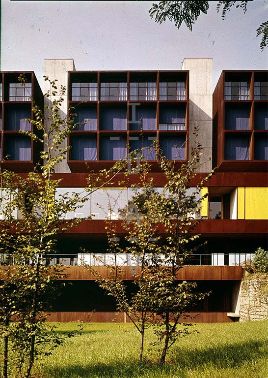 Le strutture in cemento armato verticali, vere e proprie torri di sostegno degli elementi modulari, servono anche alla distribuzione verticale e sono collegate tra di loro da travature in ferro, costituendo i sostegni dei telai verticali della struttura a cubo della residenza. La sezione didattica e di servizi si situano al di sotto di quella residenziale, in unico piano rialzato dal terreno e in un piano interrato. Un cortile quadrato centrale costituisce lo spazio nodale che mette in comunicazione i volumi, che si sviluppano lungo due direttrici parallele di penetrazione pedonale. I corpi a piastra ospitano le funzioni collettive. All'estremità nord dell'edificio era previsto un ponte per la strada pubblica, da porre in trincea, che divideva l'area attigua dal parco della villa Casana.