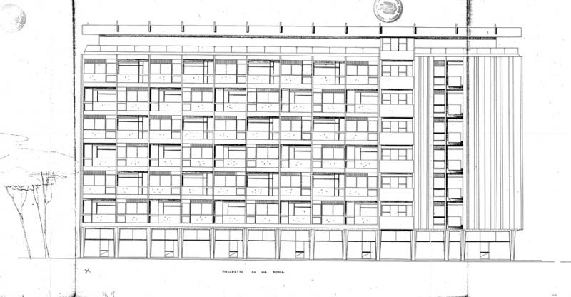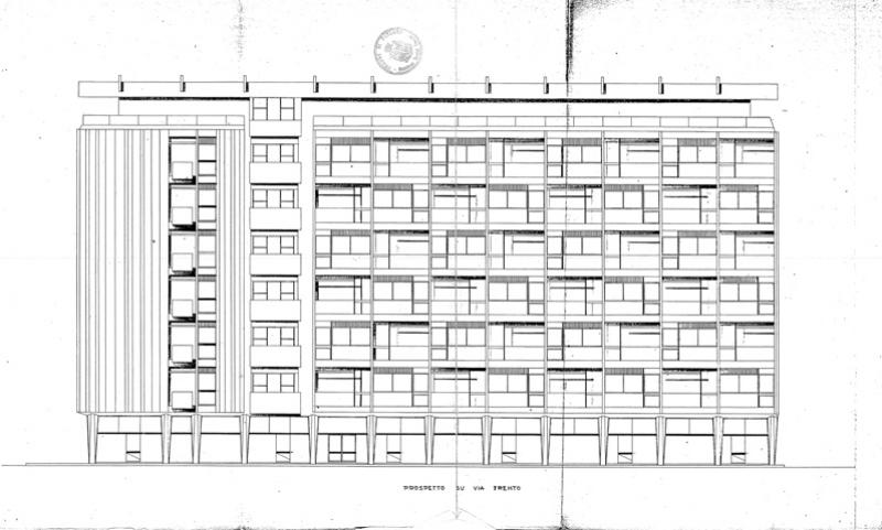 Edificio complesso è il grande blocco realizzato sul sito della demolita Villa Maria, tra via Trento e via Roma e affacciante su via Nicola Fabrizi, all’altezza dei fabbricati della parte sud di Piazza Salotto: l’impostazione tipologica vede la presenza di due chiostrine su cui affacciano servizi, ascensori e corpi scala; il fronte corto, sulla strada più importante, è leggermente ruotato, con una struttura distributiva a galleria diagonale che “stacca” il fronte come un pacchetto autonomo, interamente chiuso sui lati lunghi del complesso a stabilire un contrappunto secco al raffinato gioco di pieni e vuoti ricorrente.