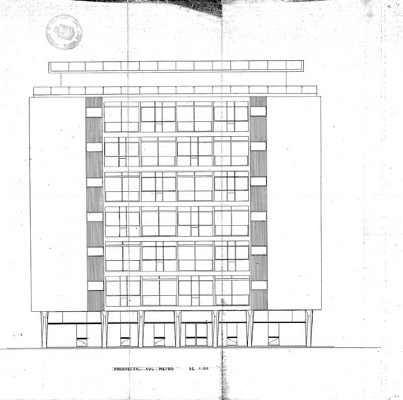 L’edificio realizzato su progetto dell’Architetto Antonio Cataldi Madonna, prevedeva sette piani più un attico, ma in fase di costruzione ha subito alcuni cambiamenti come la costruzione di un ulteriore piano e la modifica dei pilastri al piano terra. La pianta di forma rettangolare presenta una una distribuzione degli ambienti a maglia regolare. Nella parte centrale, lungo l’asse longitudinale sono ubicati i tre corpi scala che consentono gli ingressi alle singole unità e due chiostrine che permettono illuminazione e aerazione degli stessi. I prospetti dell’edificio seguono la maglia lineare della pianta creando un gioco di spazi pieni e vuoti in corrispondenza delle aperture. I parapetti dei balconi esaltano la struttura lineare della palazzina e l’alternanza dei materiali conferisce all’edificio un carattere raffinato.