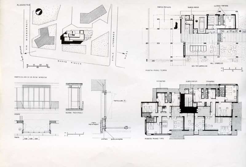L’edificio, ubicato nell’area che nella seconda metà degli anni Cinquanta è stata interessata dal piano “Città giardino” nella pineta di ponente di Viareggio, si compone di cinque piani, con due appartamenti per piano, che si elevano sopra gli spazi comuni del piano terra a pilotis. L’intervento si distingue per i dettagli funzionali e decorativi e per la chiarezza compositiva dei prospetti caratterizzati dall’alternanza dei pieni e dei vuoti generati dal motivo delle fasce orizzontali dei parapetti continui.