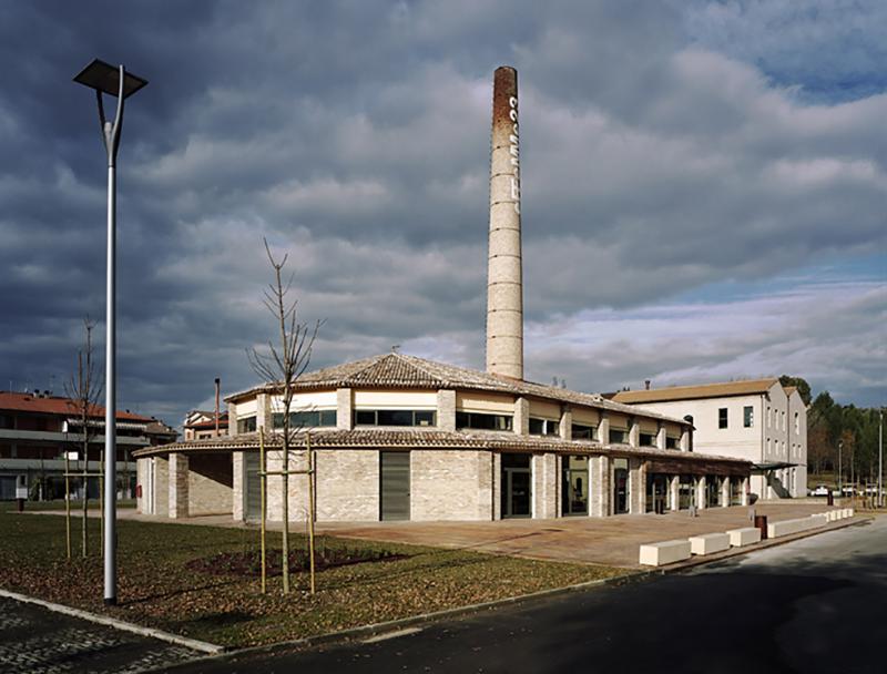 La riqualificazione funzionale della vecchia fornace costituisce un elemento di grande potenzialità sia culturale che sociale per il centro di Moie di Maiolati Spontini. Alla ricerca della qualità architettonica, i progettisti hanno saputo far interagire la storia dell’edificio con i nuovi materiali e le nuove tecniche costruttive. Molto importante e decisivo per il progetto è stata la collaborazione con la committenza, che ha partecipato attivamente alle scelte formali e tecniche del progetto (materiali, arredi, scelta e taglio degli spazi). L’intervento di recupero dell’edificio del forno (tipo Hoffmann) è stato condizionato dal punto di vista progettuale e distributivo dalla sua particolare conformazione. La disposizione e la spazialità degli ambienti interni segue, per quanto possibile, la geometria originaria dell’edificio, composta da un asse di simmetria longitudinale sul quale si inseriscono i centri delle cinque circonferenze che determinano la posizione dei due ordini di pilastri. Il progetto prevede la realizzazione di una serie di locali destinati a servizi per la collettività, quali sedi di associazioni presenti nel Comune di Maiolati Spontini, una biblioteca che si sviluppa al piano primo ed al piano soppalcato, ed un caffè letterario. Quest’ultimo avrà una funzione importante di promozione culturale, oltre alla funzione di relax e ristoro. Al primo piano l’attenzione si è concentrata sul sistema organizzativo tipico delle contemporanee biblioteche/mediateche in cui trovano posto: sale per la lettura di quotidiani e riviste specializzate, spazi per l’ascolto della musica, una zona multimediale con PC collegati in Internet, e infine una zona per i bambini/ragazzi. (GB)