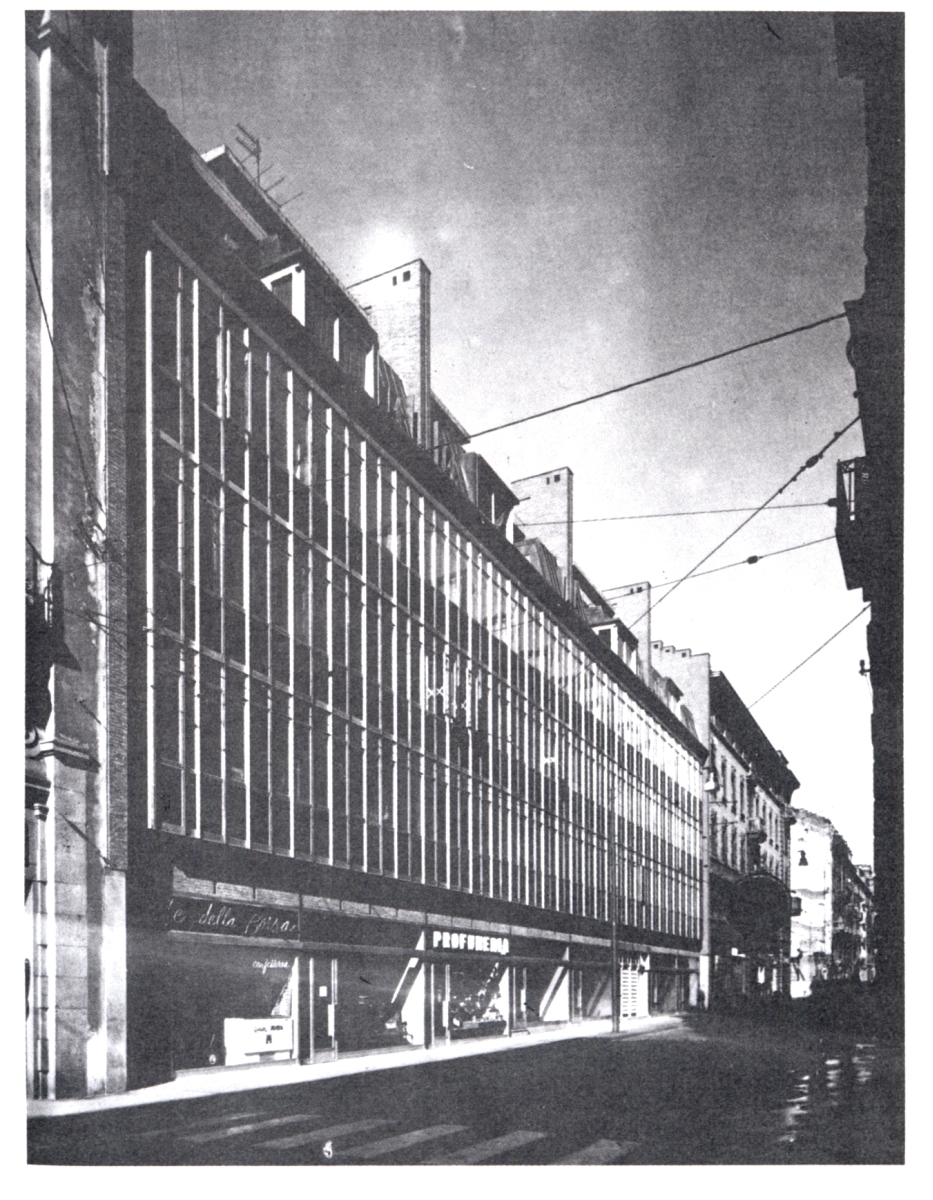 Inserito in un complesso edilizio che si affaccia su via Giolitti e via Pomba, è costruito interamente in cemento e dall’esterno sembra diviso in tre strati corrispondenti ad altrettante destinazioni d’uso: il piano terra, dove trovano spazio alcune attività commerciali, presenta pareti a cortina, i primi tre piani adibiti a ufficio sono avvolti da una leggera facciata continua e gli ultimi due livelli a uso abitativo sono in muratura faccia a vista e coperti da un tetto in rame movimentato da finestre ad arco.